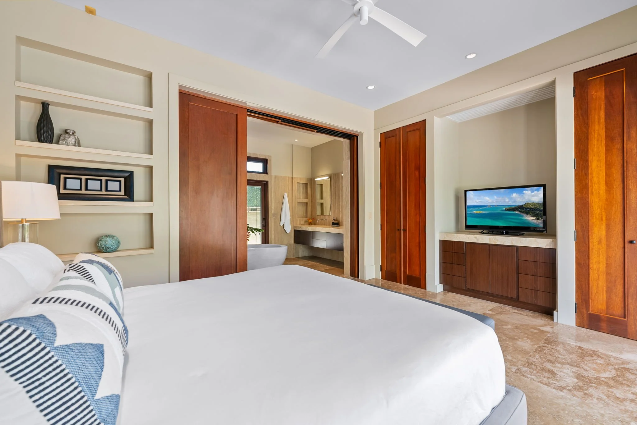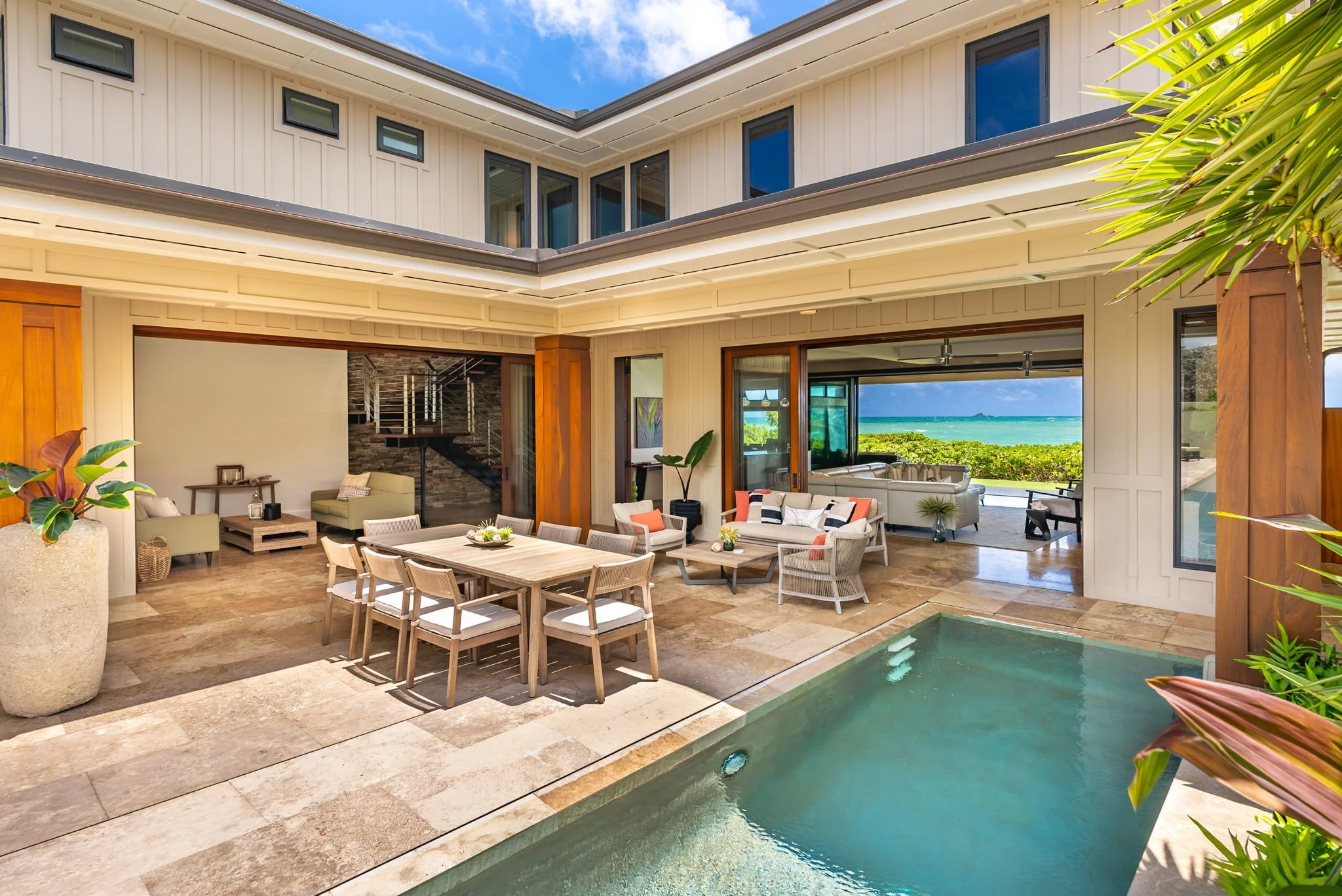 Upstairs, the enormous primary suite and lanai offer incomparable beach and ocean vistas from the Mokapu peninsula to the Mokulua Islands. The suite has a king-sized bed and a spa-like ensuite bathroom with a large soaking tub. The remaining three guest suites are equally comfortable, each featuring an ensuite bathroom with a large soaking tub. These rooms line the adjacent corridor and offer versatility to become a spa, exercise room, or poolside office if desired. A separate upstairs studio apartment completes the residence, providing a kitchenette and an ensuite bath.